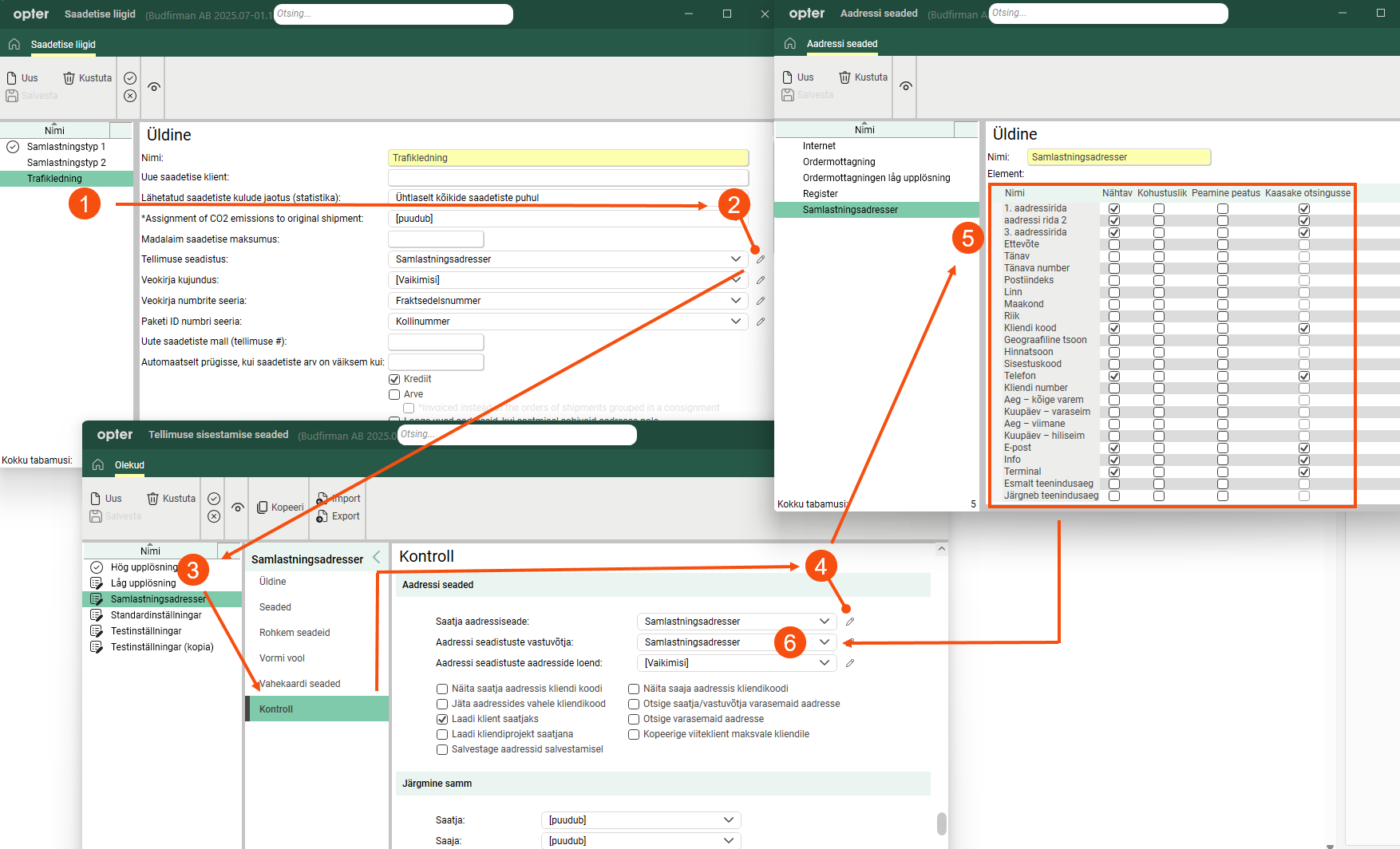 In window Tellimuse sisestamise seaded, select the same address setting for Aadressi seadistuste vastuvõtja. Save and close the window and you will be returned to the consignment type where the new order view has been selected. Also save the consignment type.