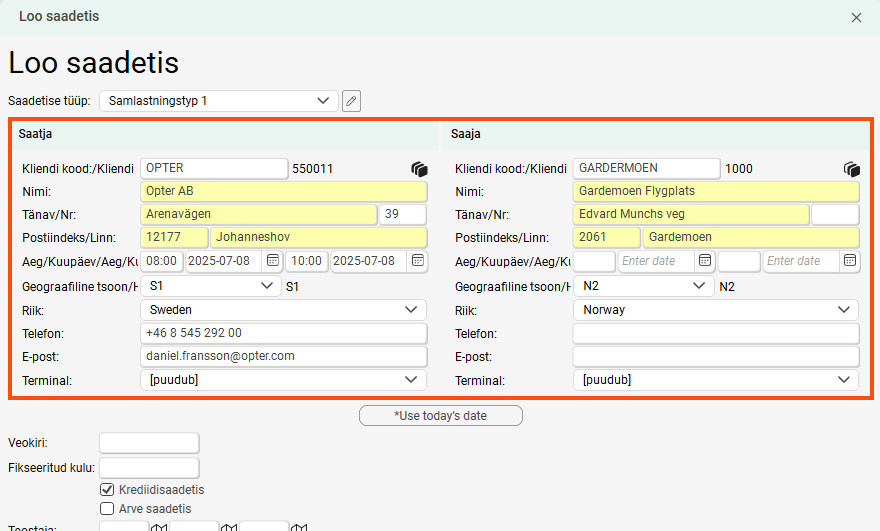 When you create a new consignment order in the dispatch system, the Loo saadetis window opens, where you can enter details such as the sender and recipient for the consignment order. You can customise which fields are displayed for the addresses in that window by creating an order view and setting it to the consignment type.
