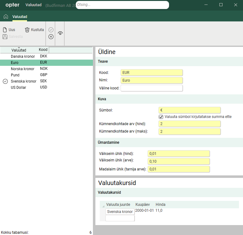Make the settings that will apply to the currency at under Üldine. The image below shows an example of settings for euros.