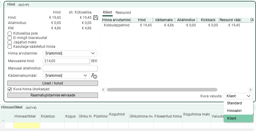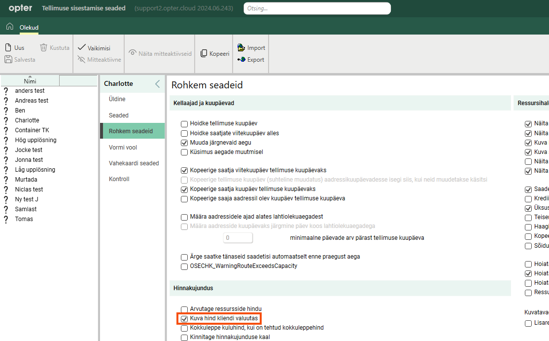 If you always want to view prices in the customer currency, go to Otseteed > Tellimuse seaded > tab Rohkem seadeid and select Kuva hind kliendi valuutas.