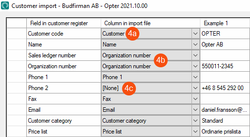 Click on Import in the bottom right-hand corner. When the import has finished, a message with the result of the import and any errors is displayed. In our example, the corporate ID number has been imported into two fields (5a), and the telephone number has not been imported (5b).