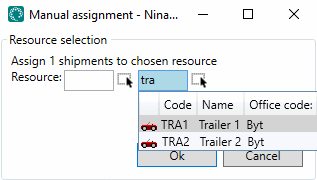 If one or more shipments have been selected with the same resource, that resource is already preselected. To allocate the shipment to that resource, click on OK. Otherwise, select a resource in one of the following ways: