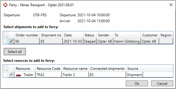 A window then appears in which you can see which shipments match the ferry times. The shipments (rows) in which the checkbox is selected match the ferry times. The resources to which these shipments are assigned are also included in the ferry booking, which is shown in the lower list by the resource checkboxes being selected.