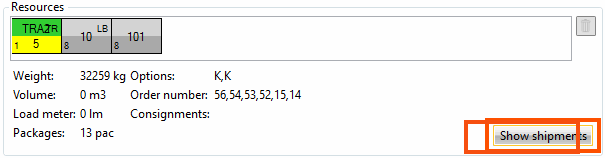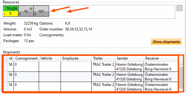 The resources shown as resource boxes in the Ressursid box are included in the ferry booking, but this does not automatically mean that they have been jointly assigned all the shipments booked on the ferry.