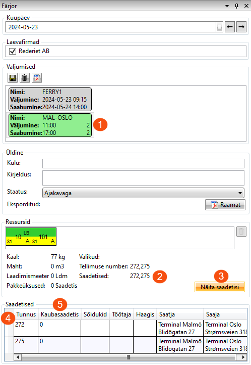 In the Ressursid box, the order numbers (2) of the consignments booked on the ferry are displayed.