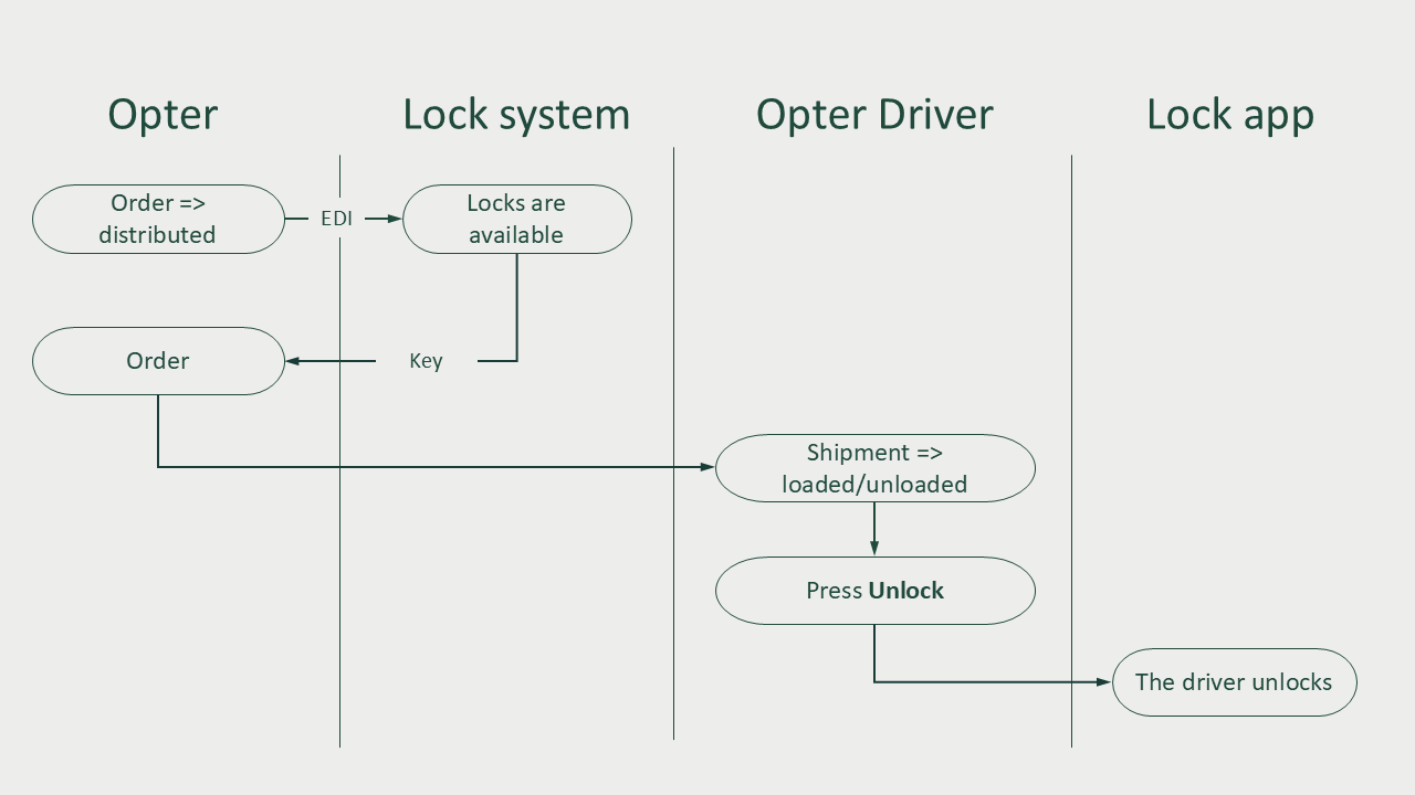 If drivers need to be able to manage smart locks in Opter Driver, you must have an EDI connection that downloads information from the locking system to the order in Opter. Contact for more information. The locks can be handled both at pick-up and delivery. The only thing that needs to be done, apart from the EDI connection, is for the driver to click on Unlock {0} in Opter Driver. No other settings are needed.