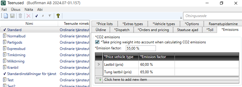 If all price vehicle types linked to the service should have the same emission factor as the service, nothing else needs to be done in the Teenused window. Then everything is ready.