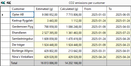 You can manually produce a statistical report whenever you want and as often as you want. For more information, see Creating a statistical report about CO2 emissions in grams. The image below shows what it might look like if you chose to show the statistics per customer. More details are shown if you click on the customer's name.
