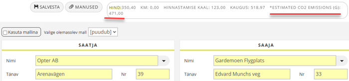 The calculated CO2 emissions of the shipment are then based on the manually entered distance on the order.
