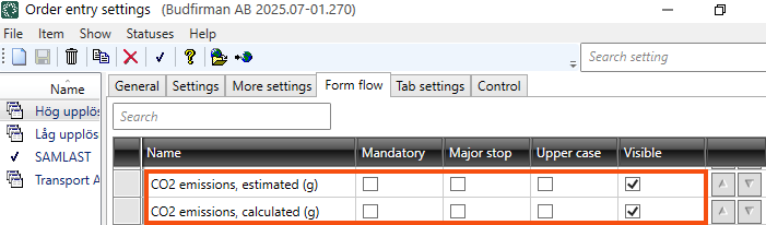 Tick the checkbox in the column Nähtav for the fields CO2 emissions, estimated (g) and/or CO2 emissions, calculated (g).
