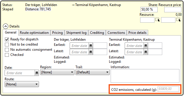 CO2 emissions, calculated (g) on the shipment. The field can be seen by clicking on Saadetised in the Detailid section and looking at the General tab. For more information, see The field for the shipment's Calculated CO2 emissions in the Order reception below.