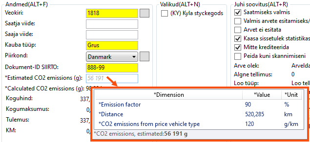 Calculated CO2 emissions (g) in the Andmed section This field shows the calculated CO2 emissions for the order, i.e. the sum of the calculated CO2 emissions for all the shipments in the order. For more information, see Calculated CO2 emissions from the order in the Order reception field below.