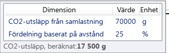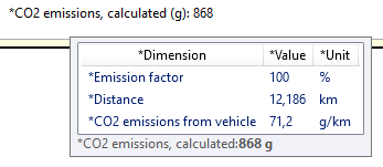 If you hover over the CO2 emissions, calculated (g) field, you will see the values used for the calculation of CO2 emissions, see the images below. For more information, see How Opter calculates CO2 emissions.