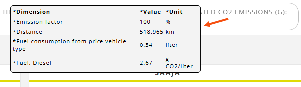 If you hover the mouse over the text Estimated CO2 emissions (g) (previously CO2 emissions (g)), the data used to calculate the estimated CO2 emissions will be displayed; see the image below.