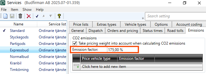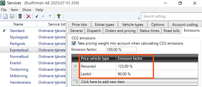 The CO2 emission factor is set for the different services, but can also be set for the different price vehicle types on each service.