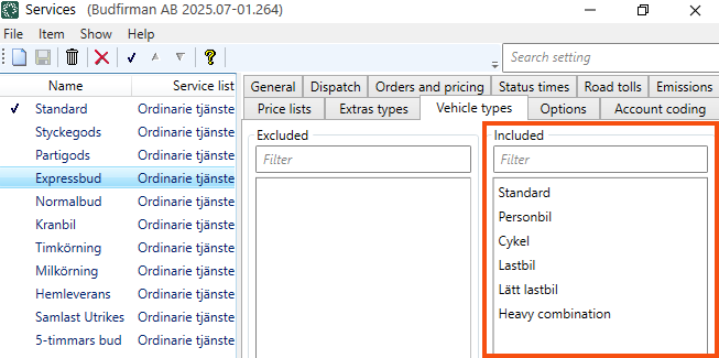 You can see which price vehicle types are linked to the service on the Vehicle types tab in the Teenused window. If you want to change which price vehicle types are linked to the service, you can double-click on a price vehicle type and it will move to the second column (Välistatud/Kaasas).
