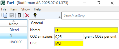 In this window you register the fuels you use. Next, you can set up fuel in the registers for vehicles, vehicle types, price vehicle types and subcontractors on the tab Emissions. For more information, see Settings for CO2 emission calculations.