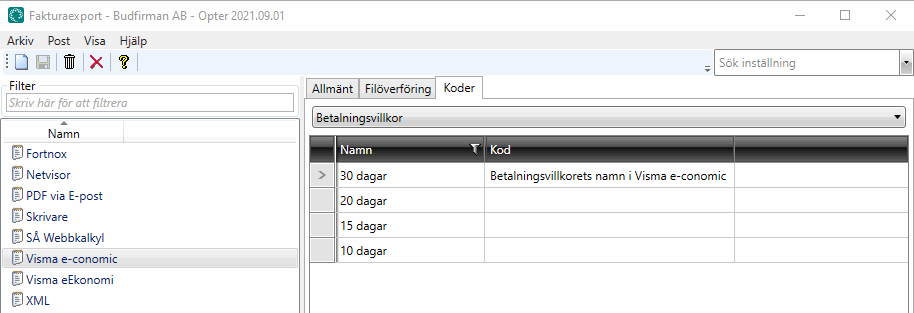 The payment conditions in Visma e-conomic are automatically matched with the payment conditions in Opter based on the number of due dates, but the payment terms can also be matched manually by name. Go to the Koodid tab and select Maksetingimus from the drop-down list. The Nimi column shows the payment conditions available in Opter. Enter the name of the corresponding payment conditions in Visma e-conomic in the Kood column.