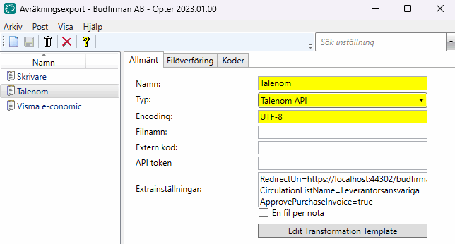 Go back to the Üldine tab. In the Extra settings field, settings can be configured that affect the supplier invoice created in Talenom. The economic units in Talenom are also mapped to economic units in Opter here. Enter each setting on a separate line.