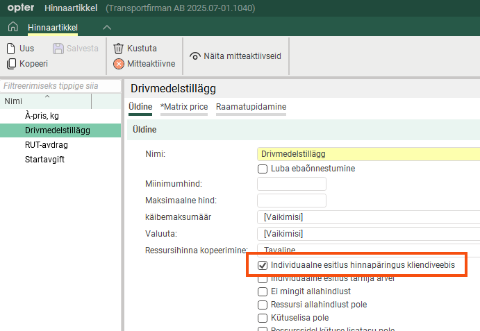 Only valid if Näita hindu above is selected. The user can get more information on how the price was calculated by clicking on it. Individuaalne esitlus hinnapäringus kliendiveebis must be marked in the Price item register on the items to be displayed on the web portals. If not all Price items are shown, the sum of the items will not match the total price of the order.
