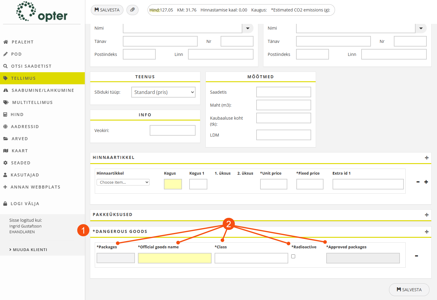 Show/hide the Dangerous goods section in the order form. The fields can be made mandatory to fill in at the time of ordering (tick Kohustuslik), which may be relevant to fulfil current legal requirements. The Reference selects which packages on the order contain dangerous goods by clicking on the grey button (1) and selecting one of the packages they have entered on the order. Dangerous goods are also shown in the detail view.