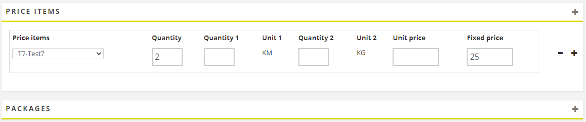 Price item price units (for example, "KG" and "KM") under Hinnaartikkel. Retrieved from the price item and cannot be changed on the web portals. What becomes unit 1 and unit 2 is determined by the order in which the price units were added to the price item in the price item registry. Hinnaartikkel must be included, otherwise this field will not be displayed as it is under that section. |