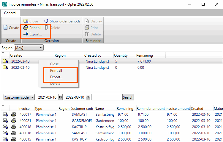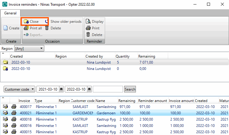 Once you have reviewed the invoice reminders and deleted those that are not to be sent, you can close the session by clicking on Sulge. Then you can no longer delete the reminders and the function to export invoice reminders becomes available.