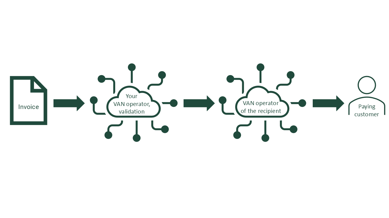 Peppol is an EU standard for e-invoices (also used in Norway, where it is called EHF, Electronic Commerce Format). Peppol consists of a network of operators called VAN operators. In order to send a Peppol invoice, you must send it to a VAN operator. VAN operators are interconnected, so the VAN operator you send the invoice to always knows which VAN operator the invoice recipient has, and forwards the invoice to that operator. Opter is not a VAN operator so you will need an agreement with one. In Norway, the most common VAN operators are Addoro/21Grams and efacto, in Sweden Addoro/21 Grams and Inexchange, in Denmark Sproom and in Finland Maventa. Opter can send Peppol invoices to most VAN operators, but not, for example, Fortnox and Visma, as invoice processing is an integral part of those financial systems.
