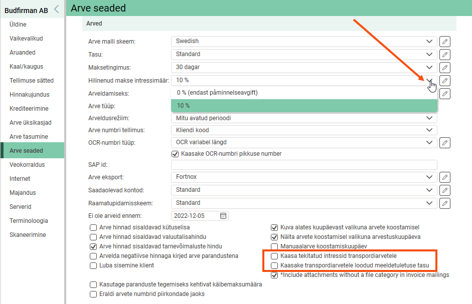 Select the required late payment interest rate from the Hilinenud makse intressimäär drop-down list.