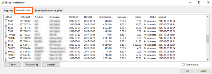 Click on Ärge esitage arvet to deactivate the selected invoice. It will then not appear in the list and the customer will not be invoiced for interest this time. To activate the invoice again, select the Näita mitteaktiivseid checkbox, highlight the invoice and click on Taasta. |
