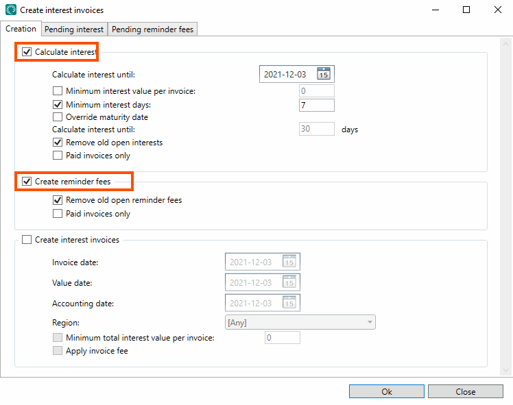 Deselect the checkboxes to include created interest and reminder fees on invoices. To include late payment interest and reminder fees on the next invoice sent to the customer, select them instead.