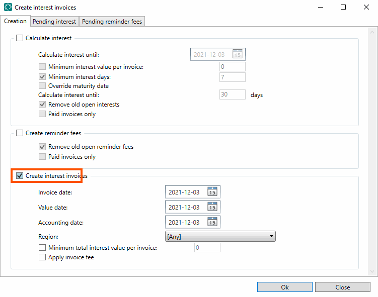 If you work based on regions, select here the regions for which the interest invoice is to be created. |