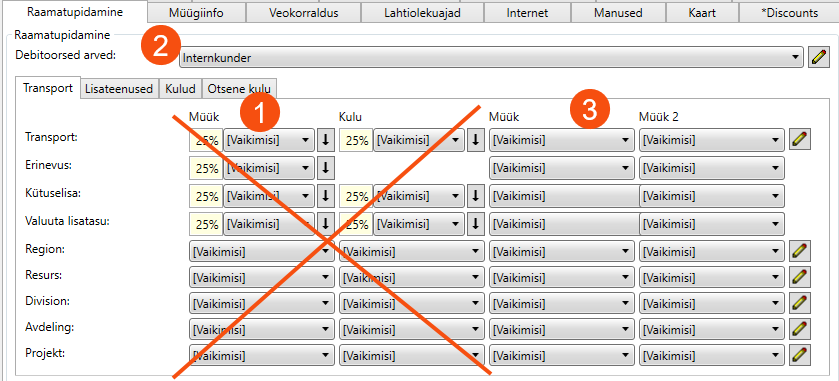 Go to the Raamatupidamine tab of the customer registry. As the function is enabled (step 1), and the customer is flagged as an internal customer (step 4), the accounts under Müük and Kulu are not used (1). Similarly, the account coding scheme for accounts receivable is not relevant for internal customers (2).