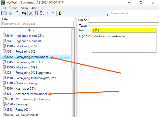 Click on Majandus > Kontod and create a sales and an expenses account with which internal invoices can be booked.