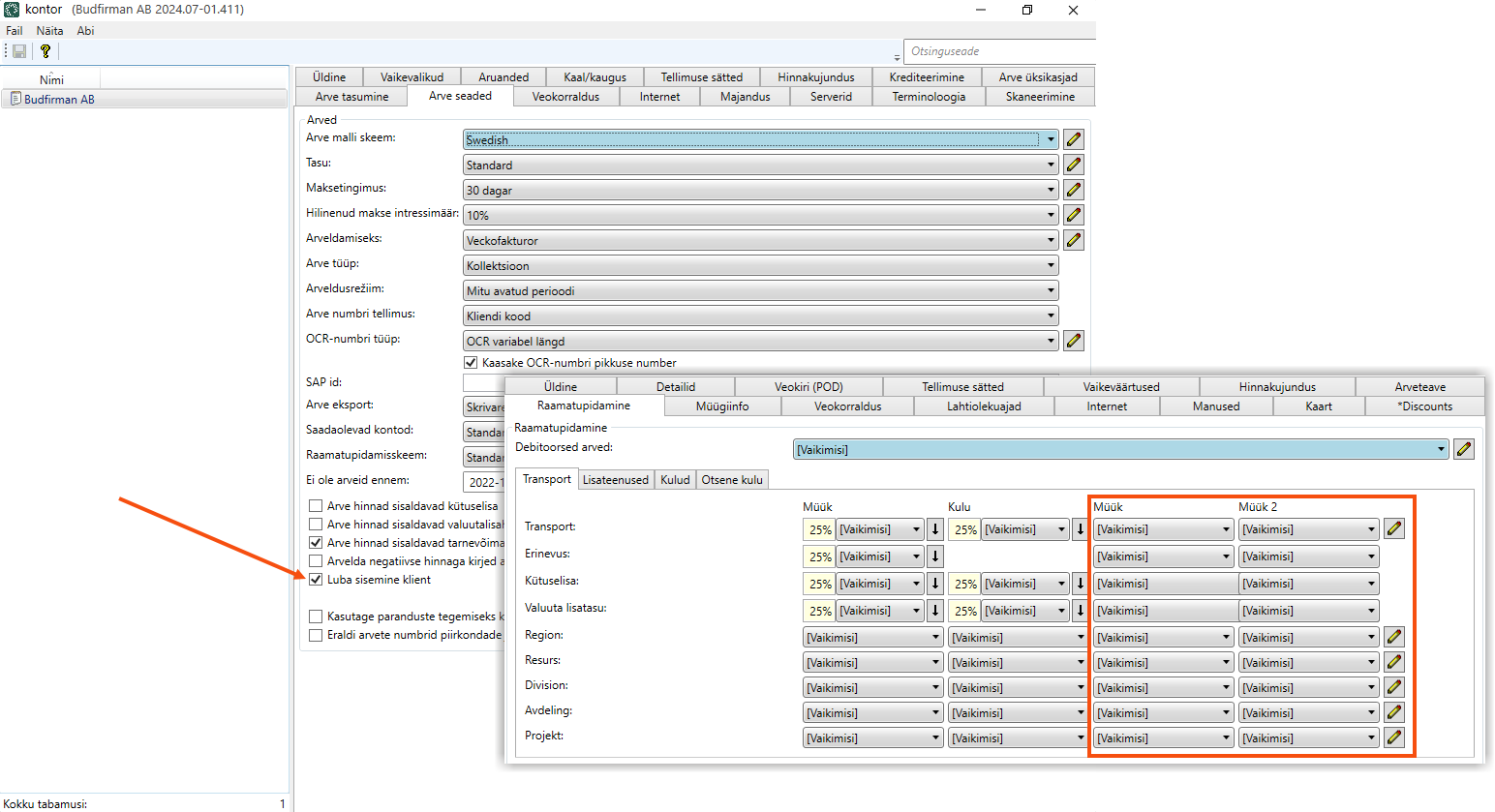 Click on Seaded > Kontorid > Arve seaded tab and select Luba sisemine klient. This enables the entire function and brings up the account coding settings for internal customers (see step 5 below).