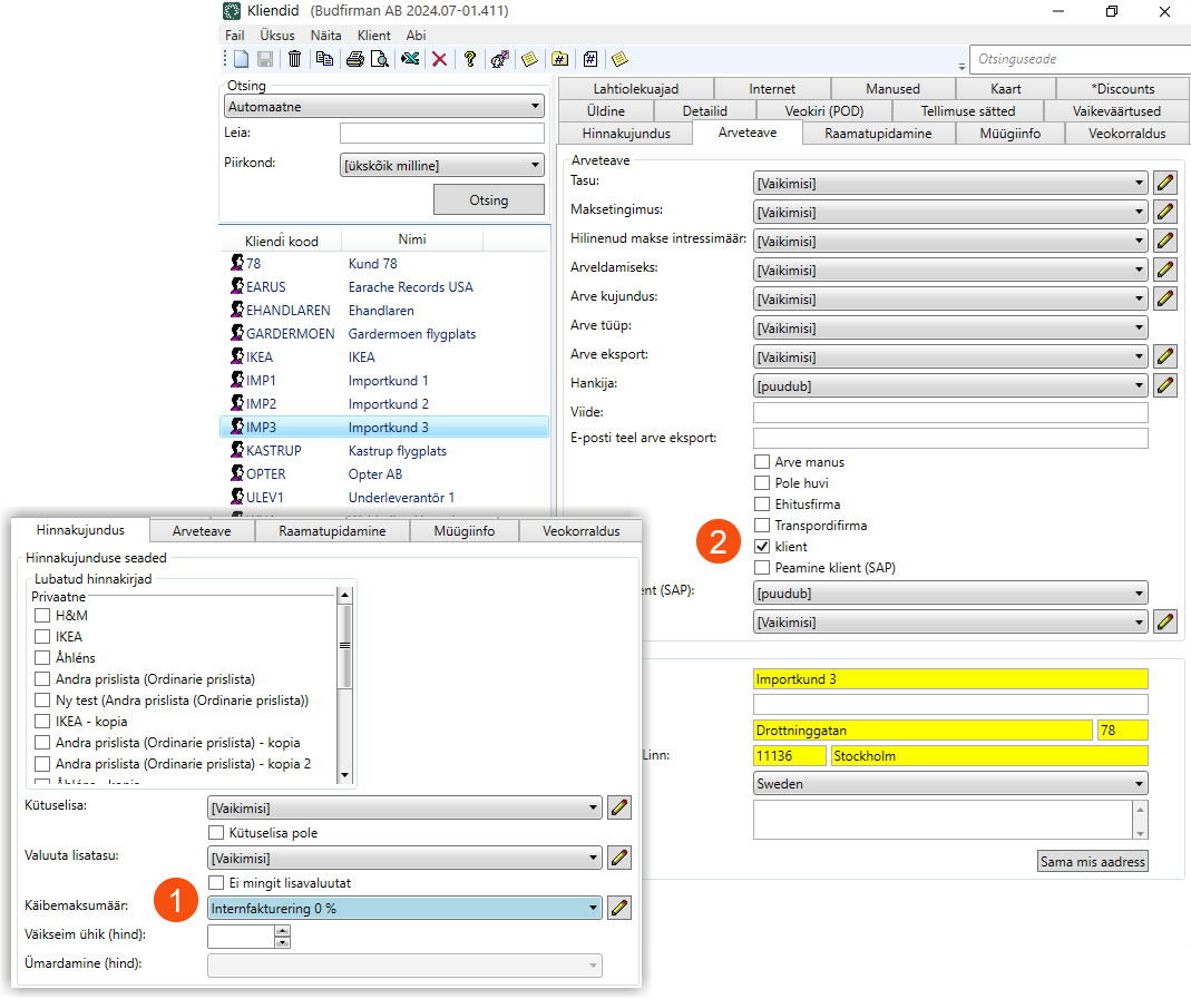 Click on Register > Kliendid and search for the department/company. Go to the Hinnakujundus tab and select the VAT rate you created in step 3 (1). Then go to the Arveteave tab and select klient (2). That setting does the following: