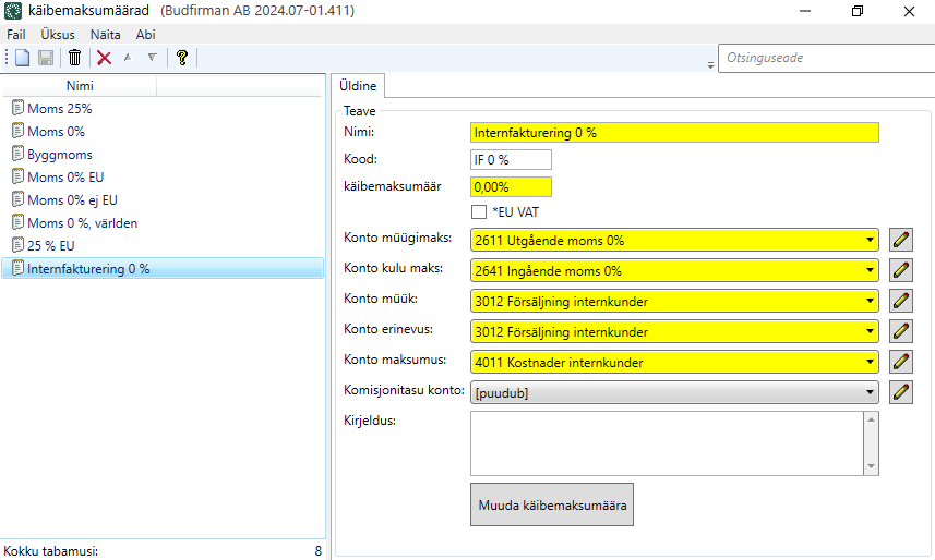 Click on Majandus > KM &määrad and create a 0% VAT rate for use with internal customers. Select the accounts for internal invoicing that were created in step 2 for sales, diff and expenses.