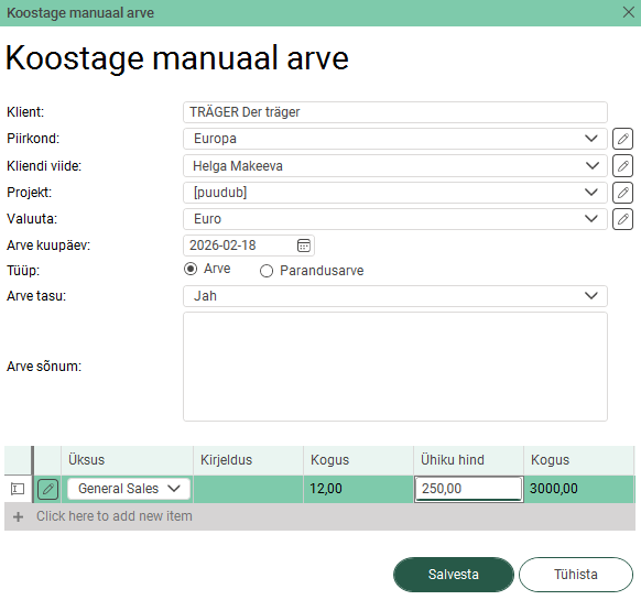 Click Fail > Manuaalarve. The Koostage manuaal arve window opens.