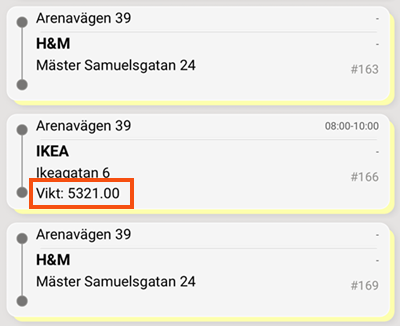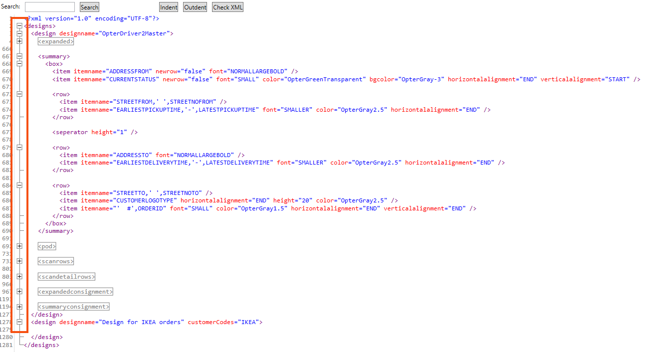 Copy the section you want to modify from the default design, in our case the mission list (summary), and make the changes. In the example below, we have added a line showing the weight of the order in the shipment list, see lines 24–26 in the example. Other sections are taken from the standard design "OpterDriver2Master".