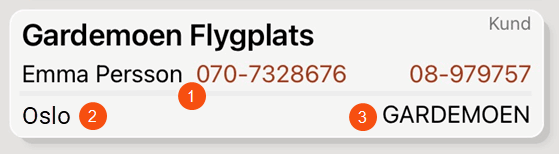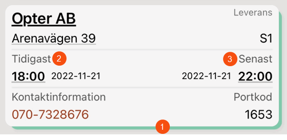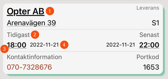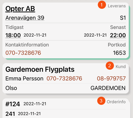The image shows the Delivery (1), Customer (2), Order info (3) sections in the detail view of the app.