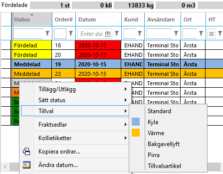 The options work in two ways in dispatch. You can right-click on an order and choose an option for the order, or you can get support for transport planning in various ways: