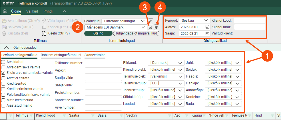 You can save searches you perform frequently so that you can use them again quickly. For more information, see . [Vaikimisi]: Search for today's orders that are not ready for invoicing. You can change the search settings, but they will be reset when you close the control. If you want to save a search, select the criteria you want to search by (1), enter a name in the field (2) and save it (3). You are deleting a saved search with