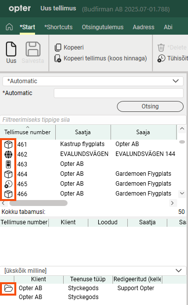 On the far left of Order reception, icons can be displayed so that you can quickly see which orders are Internet orders, consignment orders, Failed deliveries, and which orders are currently open with someone else, for example. The picture shows what the Order reception might look like in the new design. (Opter in new design is available from 2025.12.00 and 2025.07.831+.)