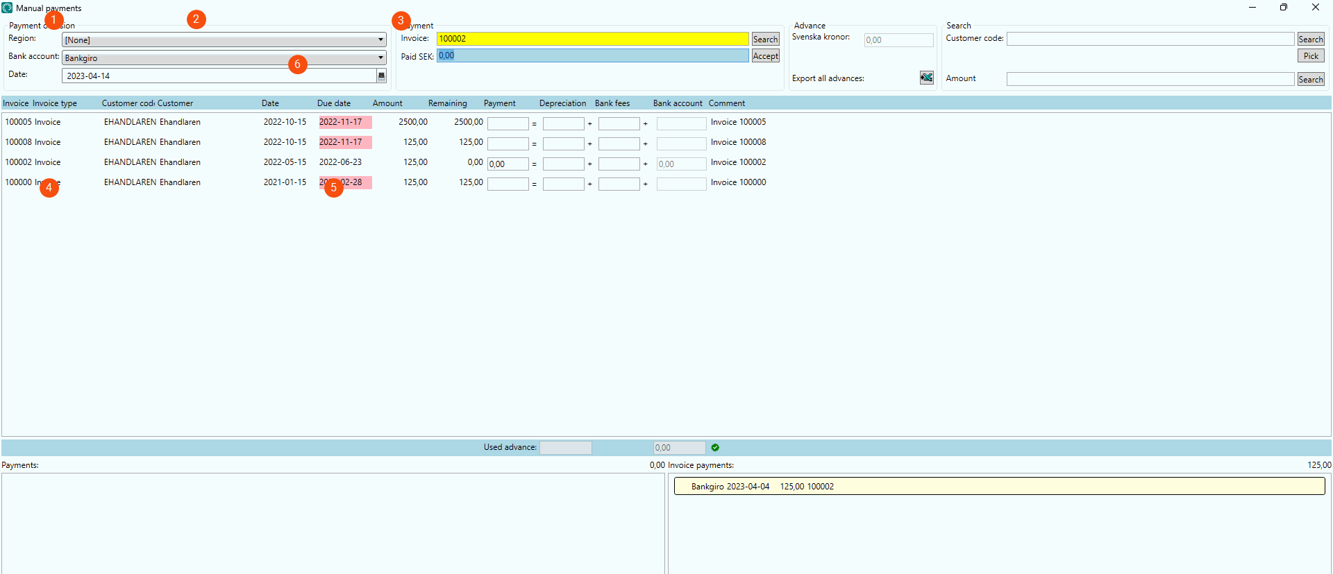 The searched for invoice is displayed in the invoice list in the middle of the window (6). If the same customer has invoices that have not yet been paid in full, they are also shown in the list.
