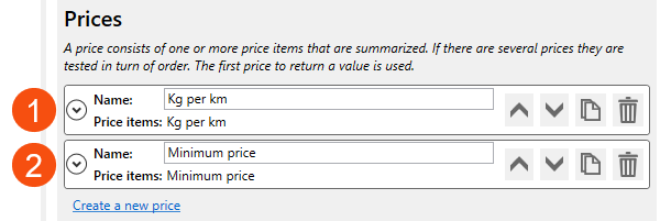 Define that the next price in the price list is used if, for example, there is no weight on an order. State that the first price in the price matrix should apply from "0.01" kg instead of "0". If the weight of the order is 0, that price item does not give a price, "Kg per km" in our example (1), and the next price in the price list is tried (2), which is a minimum price.