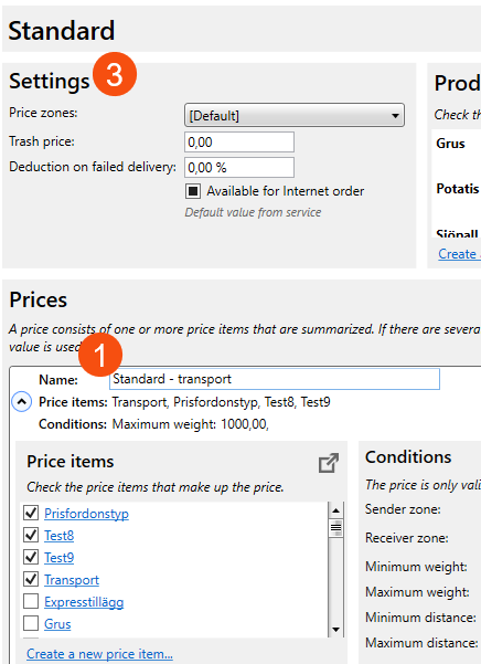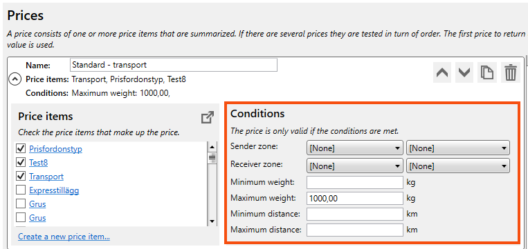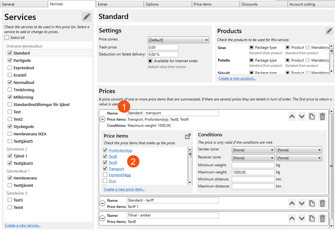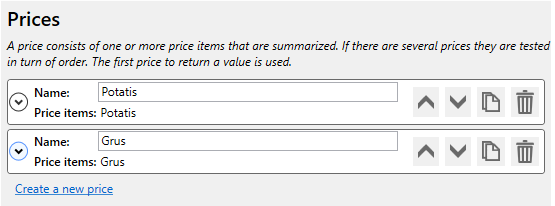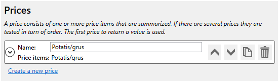 The name of the price calculation corresponds to the name of the price item (2). Price items can be added and removed with |