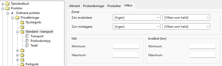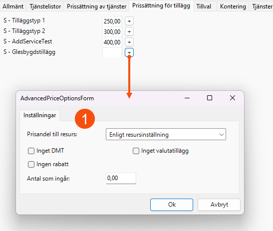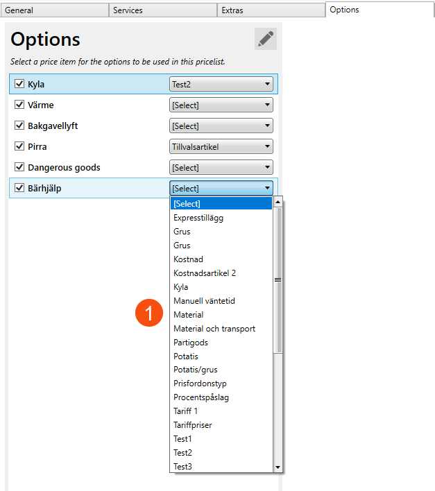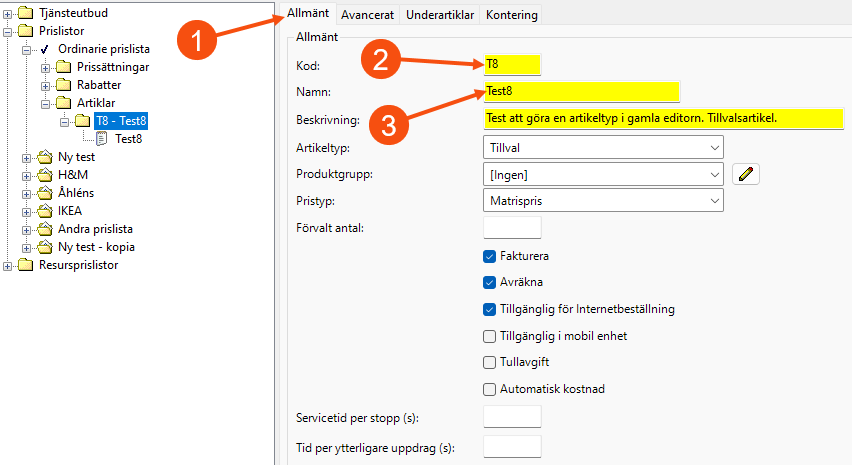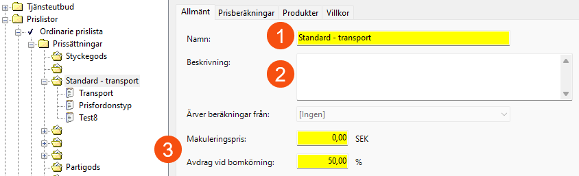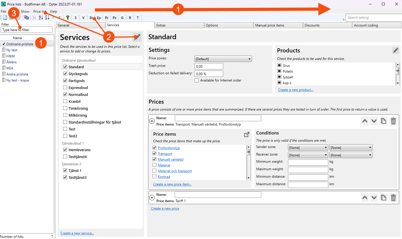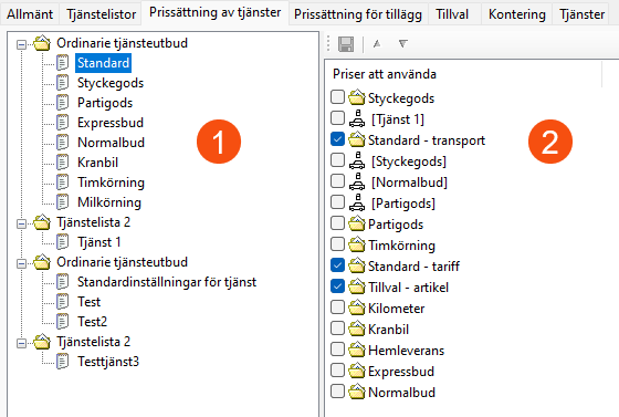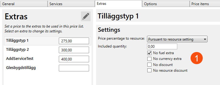 The new price list editor is organised with tabs horizontally instead of in a tree structure. The price list is made on the far left and then settings for that price list can be made on the tabs (1). The registries corresponding to the tabs can be opened by clicking on