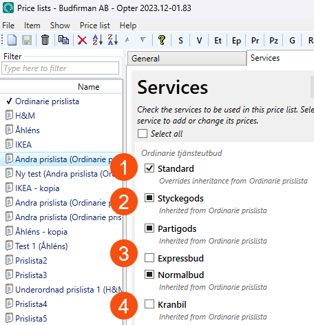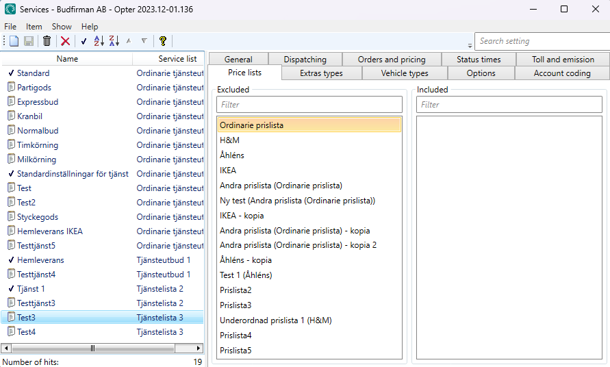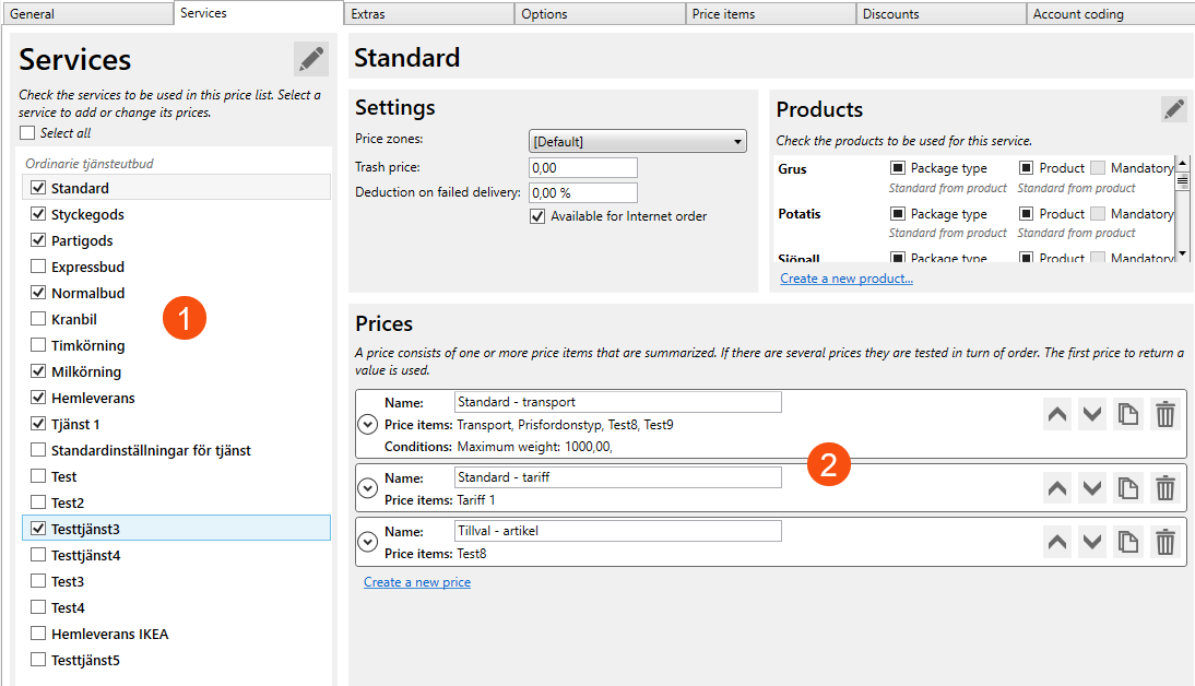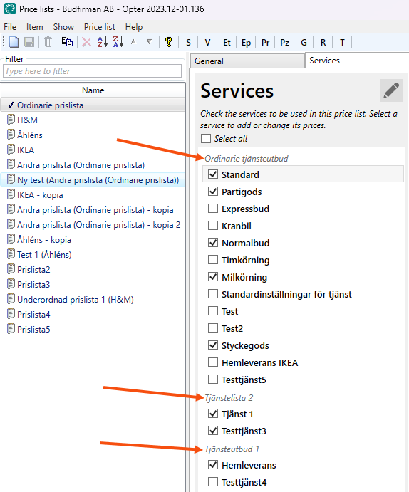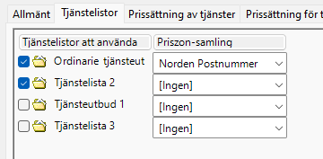 The service lists no longer have a practical function as it is now possible to freely choose which services can be used in a price list. The service lists are only used to group the services together in the service registry and on the Teenused tab in the price list.