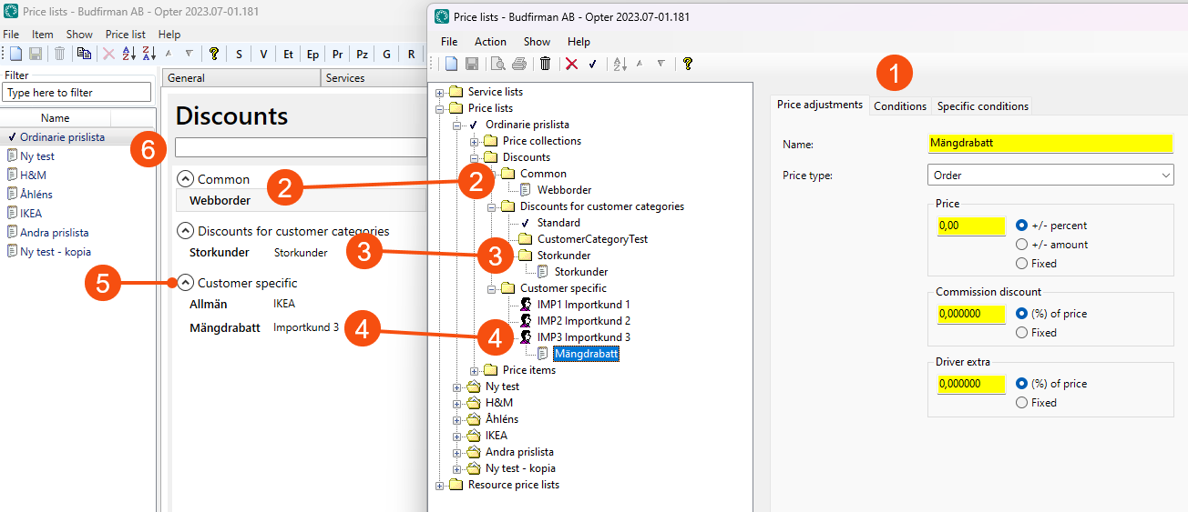 With regard to customer-specific discounts (4), it is no longer necessary to search for them one customer at a time. All customer-specific discounts are displayed directly in the list of discount and customer names. The list can be filtered by customer name if you only want to see discounts for a specific customer. Customer-specific discounts are also displayed in the customer registry (Discounts tab).