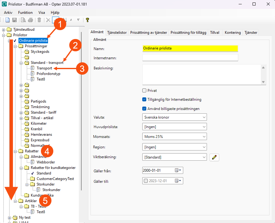 In the old price list editor, the settings were at different levels of the tree structure, price list (1) > price collection (2) > price calculation (3). Discounts (4) and price items (5) were in folders under the price list.